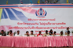 เมื่อวันที่ 12 กุมภาพันธ์ 2556 เวลา 09.00 น. นายสมศักดิ์ สุวรรณสุจริต ผู้ว่าราชการจังหวัดขอนแก่น เดินทางไปเป็นประธานในพิธี การประกาศเจตนารมณ์และพิธีลงนามบันทึกข้อตกลงร่วม (MOU) ตามโครงการ "จังหวัดขอนแก่น ไม่ยุ่งเกี่ยวกับยาเสพติด" ณ อำเภอบ้านไผ่ โดยมีนายสุรชัย วัฒนาอุดมชัย นายอำเภอบ้านไผ่ กล่าวรายงานวัตถุประสงค์เพื่อให้ทุกภาคส่วนมีส่วนร่วมในการป้องกันและแก้ปัญหายาเสพติดในพื้นที่ เพื่อให้สามารถลดปัญหาการแพร่ระบาดของยาเสพติด โดยมีผู้ร่วมลงนามบันทึกข้อตกลง (MOU) และร่วมกันประกาศเจตนารมณ์ ไม่ยุ่งเกี่ยวกับยาเสพติด จากนายกองค์การบริหารส่วนตำบลต่างๆ กำนันทุกตำบลในเขตอำเภอบ้านไผ่ มีประชาชน นักเรียน นักศึกษา ชาวอำเภอบ้านไผ่ กว่า 5,000 คน ร่วมเป็นสักขีพยาน ณ สนามหน้าที่ว่าการอำเภอบ้านไผ่ จังหวัดขอนแก่น