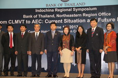 เมื่อวันที่ 13 มิถุนายน 2556 เวลา 09.00 น. นายสมศักดิ์ สุวรรณสุจริต ผู้ว่าราชการจังหวัดขอนแก่น กล่าวต้อนรับผู้เข้าร่วมสัมมนาวิชาการอินโดจีน เรื่อง จากลุ่มน้ำโขงสู่ประชาคมเศรษฐกิจอาเซียน : สถานการณืปัจจุบันและทิศทางในอนาคต (From CLMVT to AEC : Current Situation and Future Prospects) โดยมี ดร.พิชิต ภัทรวิมลพร ผู้อำนวยการอาวุโส ธนาคารแห่งประเทศไทย สำนักงานภาคตะวันออกเฉียงเหนือ กล่าวรายงานวัตถุประสงค์ เพื่อเตรียมความพร้อมในเรื่อง ระบบขนส่งและโลจิสติกส์ของไทย-ลาว-เวียดนาม ปูทางสู่ AEC 2015 ที่มุ่งเน้นให้เห็นถึงความสำคัญในการเตรียมความพร้อมด้านโครงสร้างพื้นฐานที่จะเอื้อต่อภาคการค้าและการลงทุนระหว่างกันในระยะต่อไป นางอุไร ลิ้มปิติ รองผู้ว่าการด้านบริหารธนาคารแห่งประเทศไทย กล่าวเปิดการสัมมนาปาฐกถาพิเศษ เรื่อง มุมมองต่อภาคอีสานและบทบาทของจังหวัดขอนแก่นในการเชื่อมโยงกับภูมิภาคอินโดจีน โดย นายเซี่ย ฝูเกิน กงสุลใหญ่สาธารณรัฐประชาชนจีน ประจำจังหวัดขอนแก่น การเสวนา CLMV สถานการณ์ปัจจุบันและทิศทางในอนาคต การบรรยาย CLMVT โอกาสและความท้าทาย และการบรรยายCLMV ในมุมมองของนักลงทุนไทย โดยมีผู้เข้าร่วมสัมมนากว่า 200 คน ประกอบด้วย ภาคราชการ สภาอุตสาหกรรม หอการค้า ผู้ประกอบการ สถาบันการศึกษา และสถาบันการเงินในภาคอีสาน ณ โรงแรมเซนทาราคอนเวชั่นเซนเตอร์ จังหวัดขอนแก่น