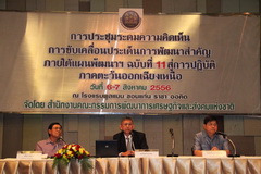 เมื่อวันที่ 6 สิงหาคม 2556 เวลา 14.00 น. นายสมศักดิ์ สุวรรณสุจริต ผู้ว่าราชการจังหวัดขอนแก่น ร่วมอภิปราย ในการประชุมระดมความคิดเห็นการขับเคลื่อนประเด็นการพัฒนาสำคัญภายใต้แผนพัฒนาฯ ฉบับที่ 11 สู่การปฏิบัติ ภาคตะวันออกเฉียงเหนือ โดยมีนายนณงค์ชัย อัครเศรณี ประธานอนุกรรมการขับเคลื่อนแผนพัฒนาฯ ฉบับที่ 11 กล่าวเปิดการประชุม มีผู้อภิปรายประกอบด้วย นายธานินทร์ ผะเอม รองเลขาธิการสำนักงานคณะกรรมการพัฒนาการเศษฐกิจและสังคมแห่งชาติ รายงานความก้าวหน้าการขับเคลื่อนแผนพัฒนาฯ ฉบับที่ 11 ระยะที่ผ่านมา นายสมศักดิ์ สุวรรณสุจริต ผู้ว่ารชการจังหวัดขอนแก่น กล่าวถึงการขับเคลื่อนการพัฒนาจังหวัดขอนแก่นในภาพรวมและการพัฒนาสู่ความเป็นเมือง และนายปรีชา รณรงค์ ผู้เชี่ยวชาญพิเศษด้านผังเมือง กรมโยธาธิการและผังเมือง อภิปรายถึงแนวทางพัฒนาระบบผังเมืองรวมที่สอดคล้องกับภูมิสังคม โดยมีหัวหน้าหน่วยงาน ข้ารชการ จาก 20 จังหวัด ในภาคตะวันออกเฉียงเหนือ เข้าร่วมประชุมกว่า 120 คน ณ โรงแรมพูลแมนจังหวัดขอนแก่น
