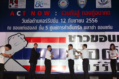 เมื่อวันที่ 12 กันยายน 2556 เวลา 13.30 น. นายสมศักดิ์ สุวรรณสุจริต ผู้ว่าราชการจังหวัดขอนแก่น เป็นประธานพิธีเปิดโครงการ วันต่อต้านคอรัปชั่น ACT NOW ร่วมกับผู้กอบกู้อนาคต จัดโดยหอการค้าจังหวัดขอนแก่น โดยมีนานสมิง ยิ้มศิริ ประธานหอการค้าจังหวัดขอนแก่น กล่าวรายงานการจัดงาน วัตถุประสงค์เพื่อการรวมพลังการต่อต้านการทุจริต การคอรัปชั่น ทั้งในภาครัฐและเอกชนทุกรูปแบบในสังคมไทย จากนั้นประธานขึ้นกล่าวเปิดโครงการ และมอบใบประกาศเกียรติคุณแก่หน่วยงานต่างๆ ทั้งภาครัฐและเอกชน ที่ได้แสดงเจตนารมณ์ เพื่อต่อต้านการคอรัปชั่น และร่วมกันต่อรูปจิกซอ ชาวขอนแก่นต่อต้านคอรัปชั่น พร้อมนำกล่าวปฏิญาณแสดงเจตนารมณ์ ชาวขอนแก่นต่อต้านคอรัปชั่น และถ่ายรูปร่วมกัน ซึ่งงานนี้มีผู้เข้าร่วมกิจกรรมทั้งภาครัฐและเอกชน ครู อาจารย์ นักเรียน นักศึกษา กว่า 1,000 คน ณ ขอนแก่นฮอล์ล ชั้น 5 ศูนย์การค้าเซ็นทรัลขอนแก่น