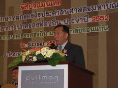 มื่อวันที่ 18 ธันวาคม 2552 เวลา 09.30 น. นายปราโมทย์ สัจจรักษ์ ผู้ว่าราชการจังหวัดขอนแก่น ร่วมเป็นเกียติพิธีปัจฉิมนเทศก์ และกล่าวต้อนรับมหาบัณฑิตใหม่ ผู้สำเร็จการศึกษาหลักสูตรรัฐประศาสศาสตร์มหาบัณฑิต สาขาวิชาการปกครองท้องถิ่น ประจำปี 2552 จากวิทยาลัยการปกครองท้องถิ่น มหาวิทยาลัยขอนแก่น โดยมีนายไพรัตน์ สกลพันธุ์ อธิบดีกรมส่งเสริมการปกครองส่วนท้องถิ่น ร่วมเป็นเกียรติและให้โอวาทแก่มหาบัณฑิตใหม่ จำนวน 1,488 คน ณ โรงแรมพูลแมน จังหวัดขอนแก่น