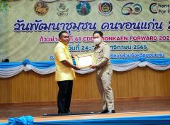 เมื่อวันที่ 25 พฤศจิกายน 2565 ณ ศาลาประชาคม ต.ในเมือง อ.เมืองขอนแก่น จ.ขอนแก่น นายไกรสร กองฉลาด ผู้ว่าราชการจังหวัดขอนแก่น เป็นประธานเปิดงานวันพัฒนาชุมชนคนขอนแก่น 2565 ก้าวย่าง 61 ปี :CDD KHONKAEN FORWARD 2023 พร้อมมอบรางวัลข้าราชการดีเด่น มอบรางวัลเชิดชูเกียรติผู้นำชุมชน กลุ่มองค์กร เครือข่ายพัฒนาชุมชนดีเด่น มอบนโยบายการขับเคลื่อนงานพัฒนาชุมชนการรณรงค์สวมใส่ผ้าไทย ในงานมีการจัดนิทรรศการแสดงผลสำเร็จงานพัฒนาชุมชนที่โดดเด่น และการจัดแสดงและจำหน่ายผลิตภัณฑ์หนึ่งตำบล หนึ่งผลิตภัณฑ์ชุมชน หรือ OTOP ด้วย