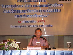 เมื่อวันที่ 13 กันยายน 2553 เวลา 09.30 น. นายธนวัฒน์ พลอยโสภณ รองผู้ว่าราชการจังหวัดขอนแก่น เป็นประธานเปิดโครงการสำรวจ จัดทำและเผยแพร่ฐานข้อมูลด้านวัฒกรรมและสินทรัพย์ทางวัฒนธรรม ภาคตะวันออกเฉียงเหนือ โดยสถาบันยุทธศาสตร์ภาคตะวันออกเฉียงเหนือ มหาวิทยาลัยขอนแก่น ร.ศ.รังสรรค์ เนียมสนิท กล่าวรายงานและวัตถุประสงค์ของโครงการ เพื่อสร้างฐานข้อมูลเบื้องต้นของแหล่งสินทรัพย์ทางวัฒนธรรมของภาคตะวันออกเฉียงเหนือ ประวัติศาสตร์ วัฒนธรรมและประเพณีท้องถิ่น แต่ละจังหวัด เพื่อใช้ในการกำหนดยุทธศาสตร์ วางแผนพัฒนา กำหนดนโยบายสนับสนุนและพัฒนาผลิตภัณฑ์ภาคอุตสาหกรรมและภาคบริการของแต่ละท้องถิ่น โดยมีผู้เข้าร่วมสัมมนา จากผู้แทนภาคราชการ ภาคธุรกิจ เอกชน นักวิชาการ และผู้แทนจากชุมชน จังหวัดขอนแก่น สารคาม กาฬสินธุ์ ร้อยเอ็ด และจังหวัดเลย จำนวน 120คน ณ โรงแรมพูลแมน จังหวัดขอนแก่น