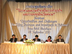 เมื่อวันที่ 29 กันยายน 2553 เวลา 09.30 น. นายธนวัฒน์ พลอยโสภณ รองผู้ว่าราชการจังหวัดขอนแก่น กล่าวต้อนรับคณะรัฐมนตรีช่วยว่าการกระทรวงอุตสาหกรรมและการค้าเวียดนาม กงสุลใหญ่เวียดนามประจำจังหวัดขอนแก่น กงสุลใหญ่ สปป.ลาว ประจำจังหวัดขอนแก่น และผู้ประกอบการ ตัวแทน บรษัท ห้างร้าน ต่าง ๆ ในการเปิดงาน สัมมนา "โอกาสและความท้าทายในการทำธุรกิจและการลงทุนเวียดนาม" โดย ฯพณฯ เอกอัครราชฑูตเวียดนามและฑูตพาณิชย์สาธารณรัฐสังคมนิยมเวียดนามประจำราชอาณาจักรไทยร่วมกับสถานกงสุลเวียดนามประจำจังหวัดขอนแก่นจัดขึ้น มีภาครัฐและนักธุรกิจการค้า ภาคเอกชน เข้าร่วมสัมมนากว่า 500 คน ณ โรงแรมโฆษะ จังหวัดขอนแก่น