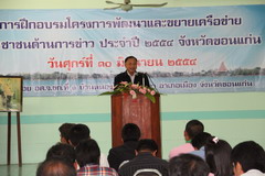 เมื่อวันที่ 10 มิถุนายน 2554 เวลา 10.00 น. นายพยัต ชาญประเสริฐ รองผู้ว่าราชการจังหวัดขอนแก่น เป็นประธานพิธีเปิดการฝึกอบรมโครงการพัฒนาและขยายเครือข่ายประชาชนด้านการข่าว ประจำปี 2554 ณ ห้องประชุมกองร้อย อส.จ.ขก.ที่ 1 อ.เมือง จ.ขอนแก่น โดยนายศุภชัย ลีเขาสูง ป้องกันจังหวัดขอนแก่น กล่าวรายงานวัตถุประสงค์เพื่อให้ประชาชนได้เข้ามามีบทบาทและส่วนร่วมในการแก้ไขปัญหาต่าง ๆ ในพื้นที่ เกิดการบูรณาการด้านการข่าวร่วมกันอย่างมีประสิทธิภาพ ตลอดจนให้ผู้เข้าร่วมอบรมได้ทราบถึงบทบาทหน้าที่ของประชาชนในการมีส่วนร่วมแก่ไขปัญหา เพื่อสามารถแจ้งข่าวสารให้กับทางราชการได้อย่างรวดเร็ว ถูกต้อง ทันเวลา โดยมีแกนนำประชาชน เจ้าหน้าที่ผู้ปฏิบัติงานเข้าร่วมอบรมจาก 26 อำเภอ ๆละ 4 คน รวม 104 คน